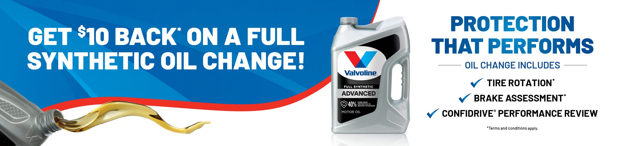 Includes up to five quarts of oil, multi-point vehicle inspection, 4-tire rotation, and chassis lube (where specified by manufacturer). Additional oil over 5 quarts costs extra. Additional charges may apply to the retail price including a fluid and/or filter disposal and/or recycling fee. An additional service charge of up to 13% no greater than $49.95 may be added for shop supplies and equipment cost. Other restrictions, fees, and taxes may apply. Most vehicles. Participating stores only. See store for complete details. Visit www.valvolineglobal.com to learn more about additional benefits.